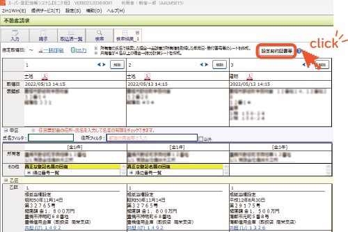 「請求」のタブを開き、請求内容が登録された状態で、タイマーボタンをクリックします。例えば翌日の不動産売買決済の立会のため、あらかじめ日時を指定しておくと、当該日時に自動で不動産登記情報を請求することができます。取得した不動産登記情報は解析処理され、表形式の状態で画面に表示されます。