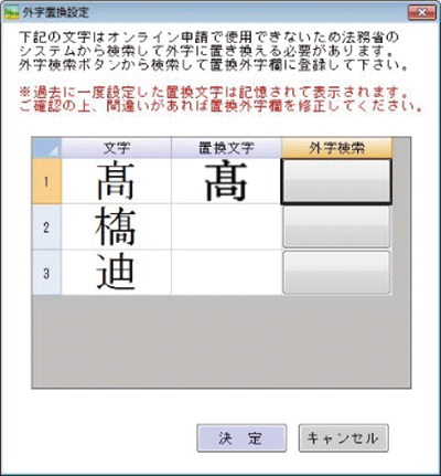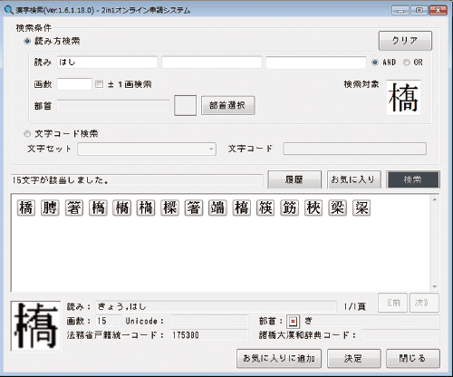 平成28年3月22日に運用が開始された「登記統一文字」「戸籍統一文字」に対応済。オンライン申請書を作成する際に登記統一文字などから取得すべき文字をソフトがリストアップします。また、「読み」「画数」「部首」と様々な文字検索が可能です。しかも該当する文字を検索⇒検索画面に今探している文字が表示されるので見比べながら探すことが出来、一度検索した文字はソフトが記憶するため2回目以降は検索不要です。検索した文字を使ってオンライン申請書を自動で作成します。