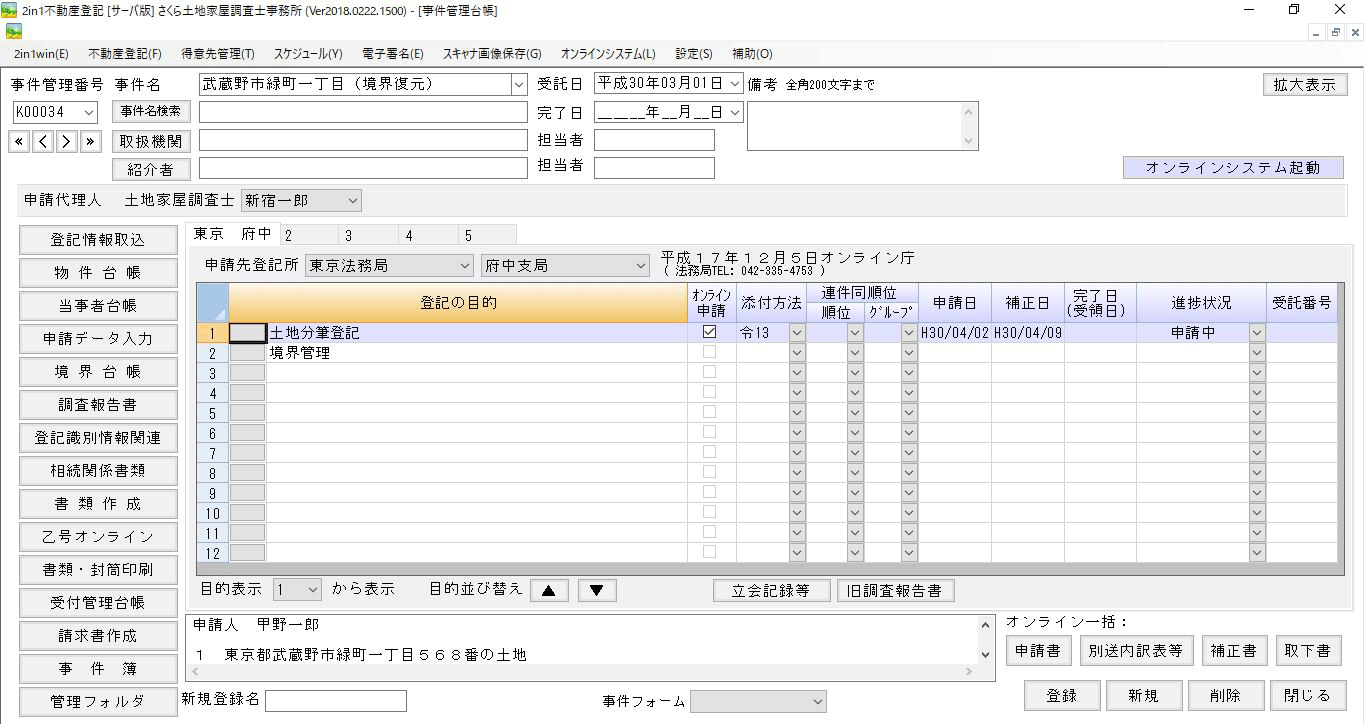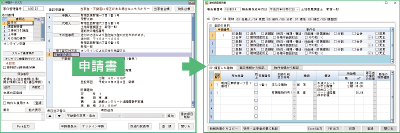 実際に申請データとして台帳に入力していない物件も、非事件乙号申請として管理することが可能です。物件台帳に入力している物件と一緒に乙号オンライン申請をすることも可能です。また、物件を物件台帳へ転記すると、申請データとして使用することができます。