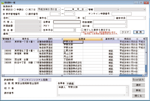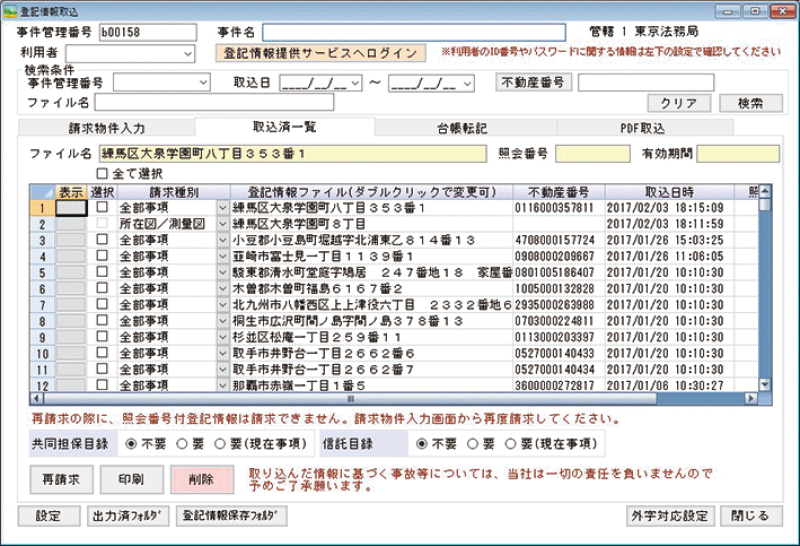 非事件管理(乙号)台帳ではオンライン物件検索機能があります。オンラインで物件を検索して請求ができますので、外字のある所在や山地番耕地番でも物件の所在、地番を間達えることなく請求できます。