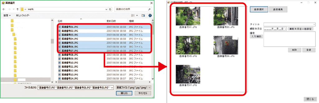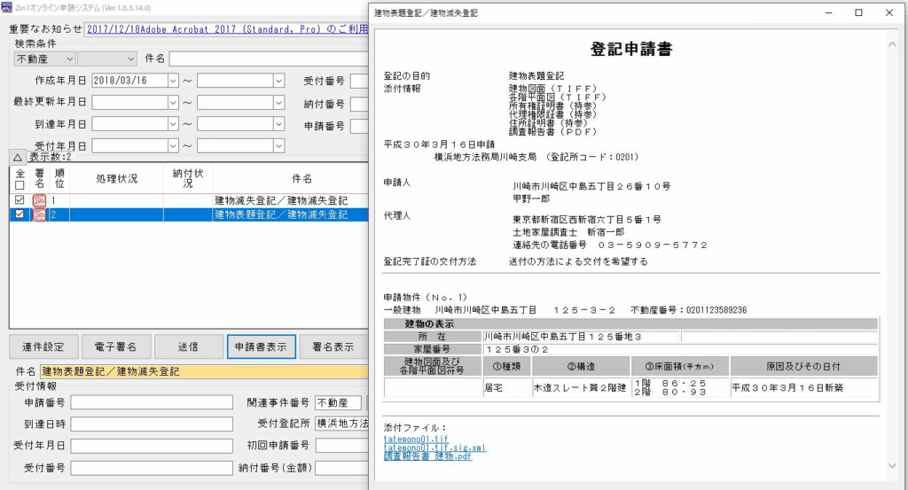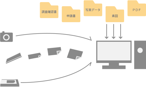スキャナーで読み込んだPDFファイルや、CADソフトで作成したTIFFファイルやXMLファイルを登録し、オンライン申請書に添付できます。
