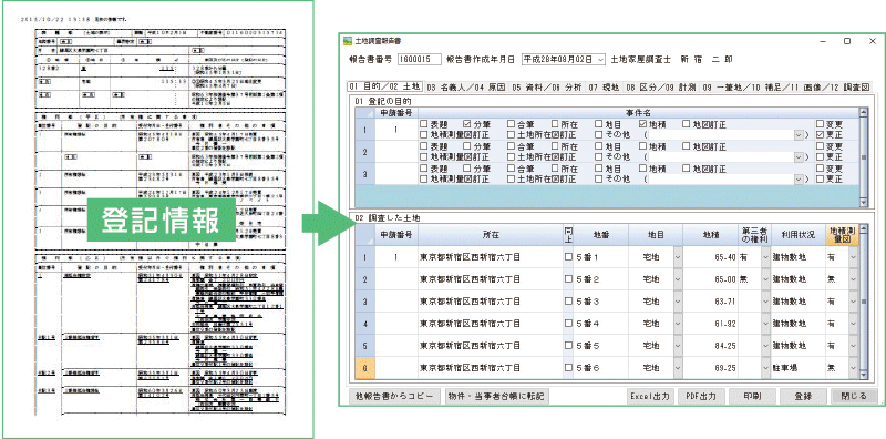 自動解析された不動産登記情報はExcelに出力して、取引立ち合いの資料や依頼者への説明資料として活用することができます。