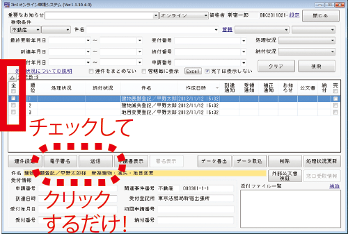 スキャナーでPDFに変換した書類や調査報告書、建物図面等の添付書類をオンライン申請データに添付後、書類を選択して電子薯名ボタンをクリックするだけで、PDFファイル、XMLファイルに一気に署名ができます。今までは、1つのファイルに1回ずつ署名を行い添付する方法のみでしたが、一括署名することでオンライン申請がより簡単になります。