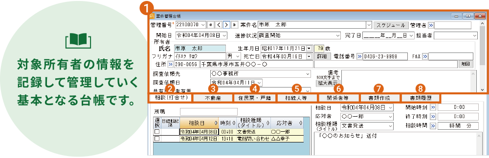 - 相続人調査にかかる関係者(法人・個人)の情報を登録します。登録した関係者ごとの連絡履歴を管理できます。相続財産管理人を選定する場合に家庭裁判所や司法書士等との手続き履歴を管理できます。