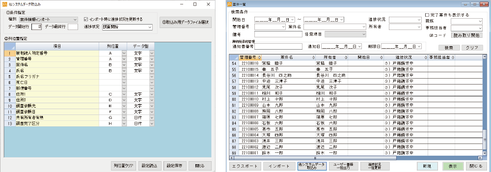 案件管理台帳は対象所有者ごとに手入力で登録しますが、ExcelファイルやCSVファイルをインポートすることで一括作成も可能です。基幹システム等、他システムから出力したデータをインポートすることで、入力にかかる工数を大幅に削減できます。