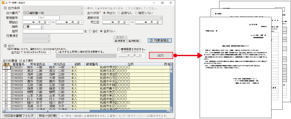 通知書等、被相続人のご自宅や親族宛て文書を一括で発送できます。書類を出力するとともに書類の発送履歴を同時に作成することもできます。返信文書のある書類には返信期日を設定することで期日管理が可能です。