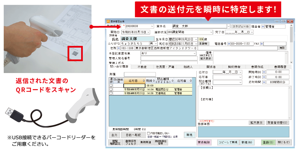 書類の種類と宛先を特定するQRコードを差し込み印刷できるようになりました。あわせて、ユーザー書類に印字されたQRコードを読み込むと対象の案件を表示し、返信の受け取り履歴を記録する検索機能を追加しました。何百件と発送した文書の返信を受け取った際の返信元特定が容易かつ正確になります。