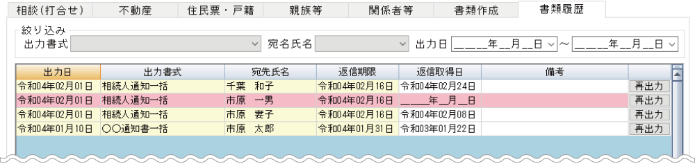 - 各種文書の出力履歴(送付履歴)、再出力、返信期日を管理します。