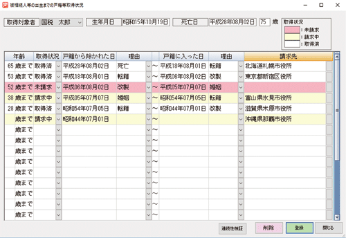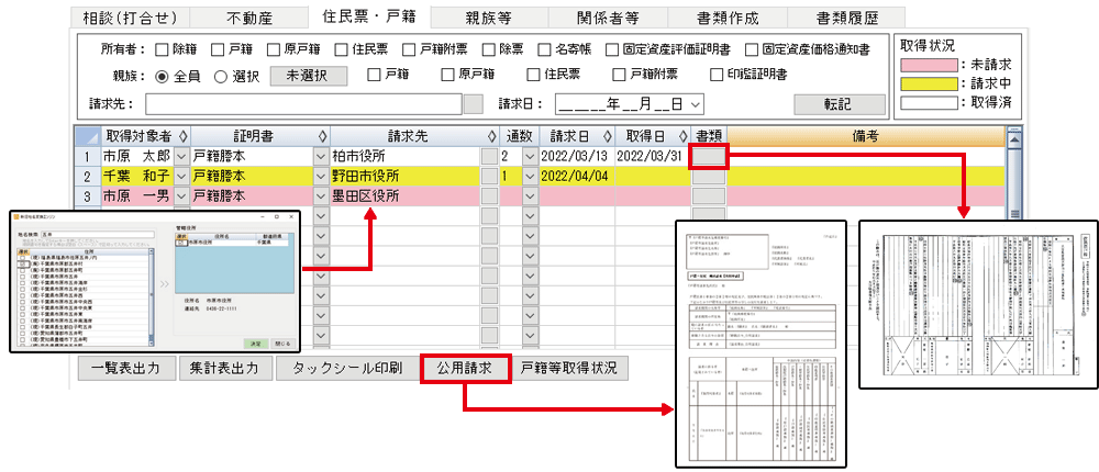 戸籍等書類の請求履歴を管理します。各書類の請求から取得までの状況が色別で表示され、進捗が一目で確認できます。公用請求書も任意の書式で作成可能です(Excel・Word)。取得した書類のイメージを保存して簡単に閲覧できます。