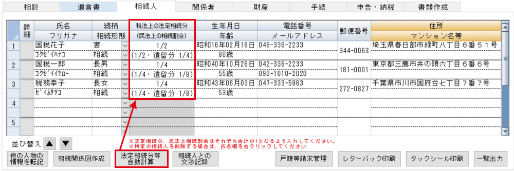 昭和23年1月1日以降に発生した相続については相続人の情報を基に、法定相続分及び遺留分権利者(兄弟姉妹を除く相続人)については遺留分割合もボタンを押すだけで自動的に計算して表示します。
