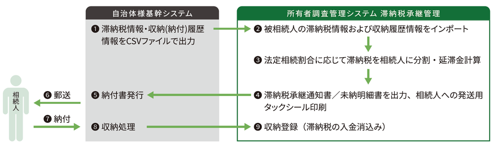基幹システムから被相続人の滞納税情報/収納履歴情報をCSVファイルで出力し、所有者調査システムにインポートします。