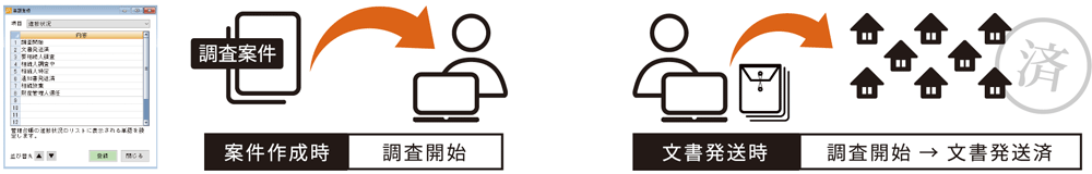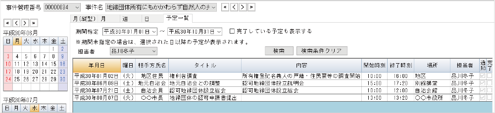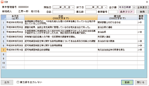 自治体の事業目的や土地の状況等により、解決に至る道順は様々ですが、スケジュール機能、期日通知機能、日誌を組み合わせながら解決に至った経緯等を記録することにより、これから先発生する問題解決の指針とすることができます。また、事務引継ぎもスムーズに行えます。