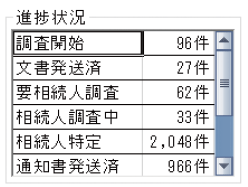 案件管理情報「進捗状況」は各案件の進捗管理に使用する項目です。進捗状況には業務フローに即した任意のステータスを設定可能です。案件管理台帳で個別に編集するほか、特定のタイミングで複数案件のステータスを一括で変更することもできます。