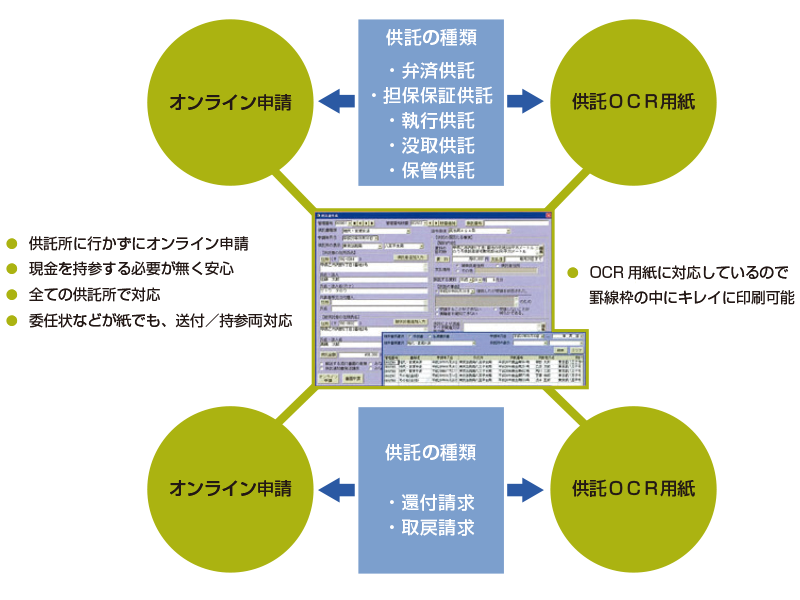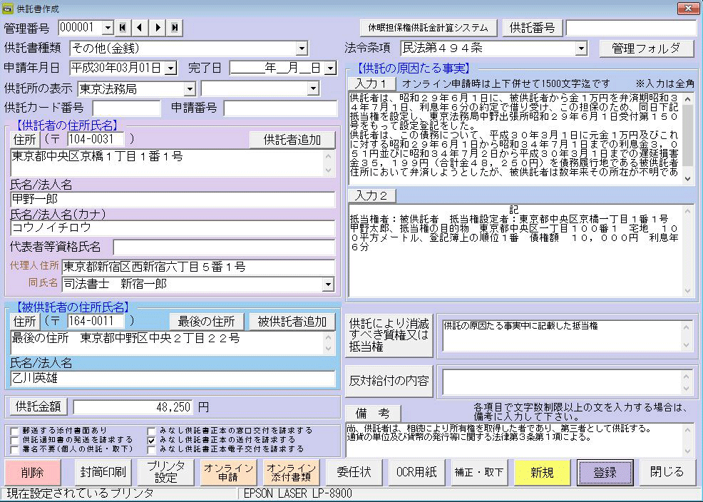 入力画面はOCR用紙と同じ構成なので、迷わず入力できます。地代、家賃の返済供託のように繰り返し行われる供託についても、前回のデータをコピーして簡単に作成できます。