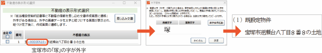 取得した登記情報に外字がある場合には、変換文字を関連付けることができます。登録しておくと、各申請書類に置き換えて出力します。