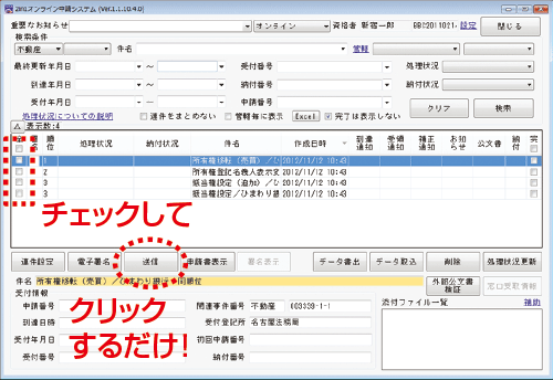100筆でも500筆でも、ソフトが自動ログインして、データを取得します。また、取得できなかった登記情報は、結果が表示されますので、登記情報が取得できない場合も一目瞭然です。