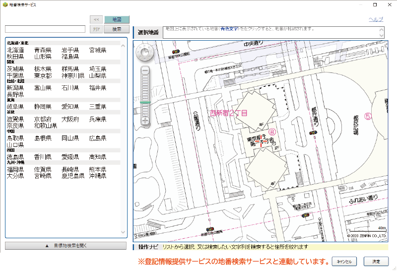 また、地番検索サービスとも連動していますので、住所から地番を検索して登記情報を請求する事が可能です。メニューから住所を入力し、該当物件上の地番をクリックすると、システム上に選択した地番が反映されます。