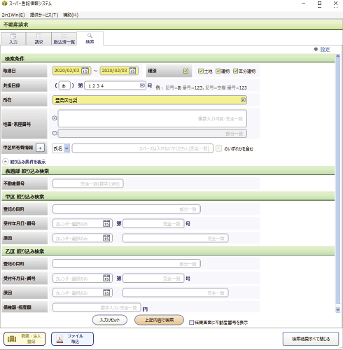 所在と地番・家屋番号の範囲を指定して検索する機能です。ヒットした物件は請求物件として取込、そのまま請求できます。