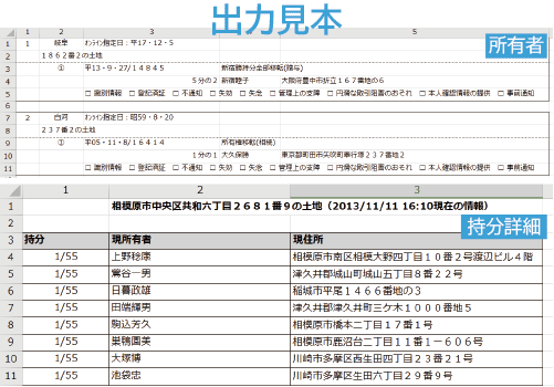 自動解析された不動産登記情報はExcelに出力して、取引立ち合いの資料や依頼者への説明資料として活用することができます。