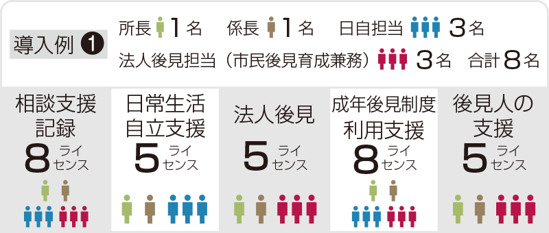 所長1名、係長1名、日自担当3名、法人後見担当(市民後見育成兼務)3名、合計8名で導入の場合