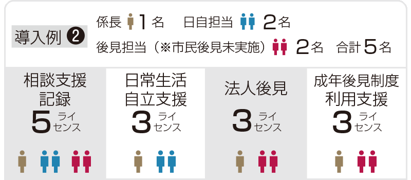 係長1名、日自担当2名、後見担当(※市民後見未実施)2名、合計5名で導入の場合