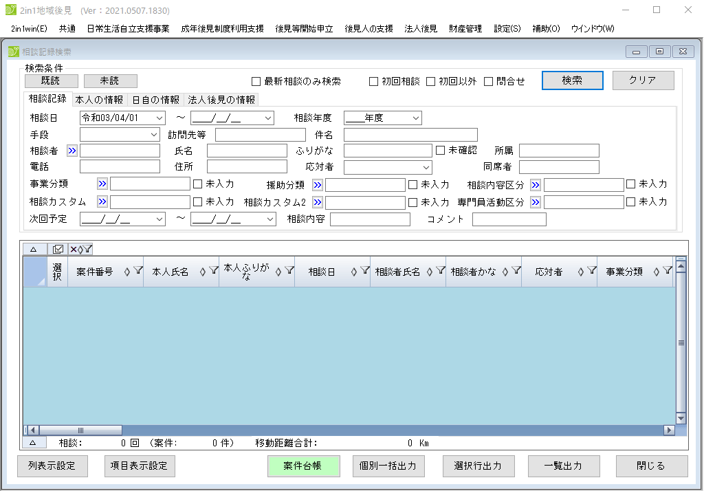地域後見システムは、「メイン画面」と、「案件画面」で構成されています。メイン画面(検索や集計、設定など)は、常に起動しているウィンドウとなり、案件画面(本人の台帳)は、複数の案件を同時に開くことができます。