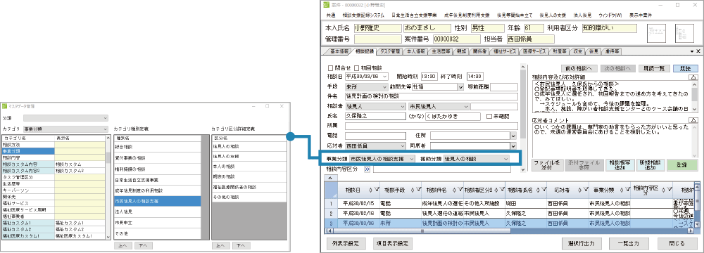 - すべての記録を一元管理。事業分類や相談内容区分などで仕訳し管理します。
