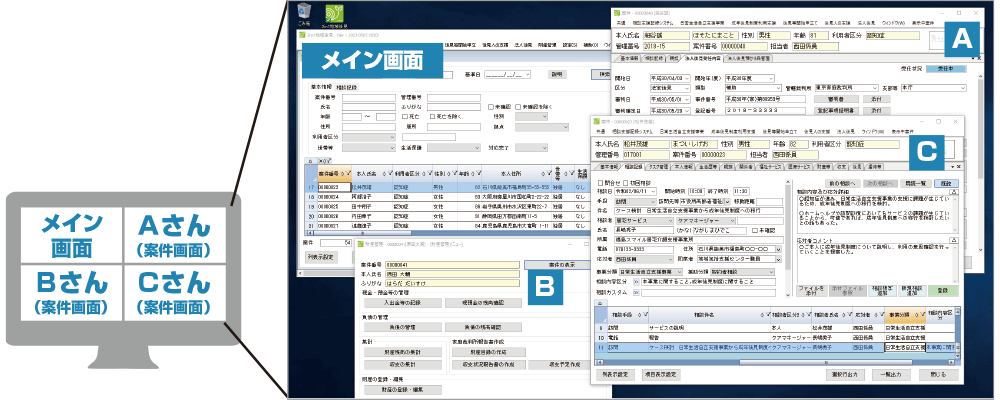 地域後見システムでは2人、3人の台帳(案件画面)を同時に表示でき、効率的に事務作業が行えます。集計画面も同時に表示でき、様々な情報を同時に確認しながら作業できます。例えば、Aさんの記録入力中に、Bさんの電話相談があっても、Aさんの画面を閉じることなくBさんの記録を作成できます。