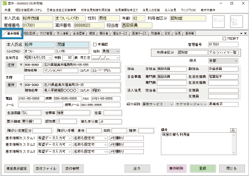 - 住所、生活保護、要介護度、利用者区分、担当者など、履歴も登録できます。