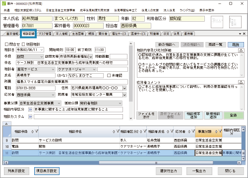 相談や支援の記録を入力します。日常生活自立支援事業の記録も、成年後見制度の利用支援や法人後見などの記録も、記録はこの画面で一元管理します。