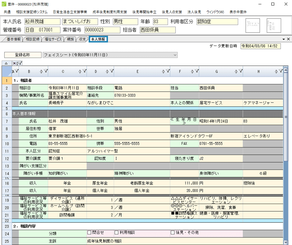 氏名、住所、生活保護、要介護度、利用者区分(認知症等)、担当者等を入力します。入力した内容は、上部の案件情報に表示されます。