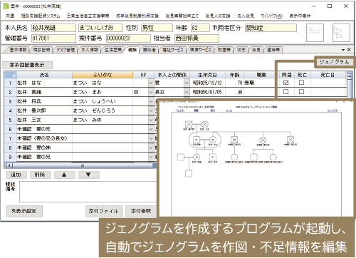 入力された親族データをもとに、ジェノグラム・エコマップ、家系図を作成します。もちろん、編集も簡単!