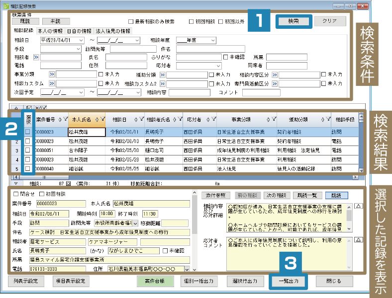 「相談検索」画面では、さまざまな条件から、相談記録を迅速に探すことができます。