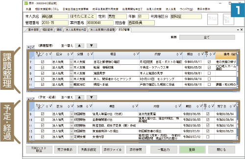 - ケースごとに、「課題整理」と「予定・経過」に分けて、タスクを登録し、進捗管理ができます。「課題整理」では、ケースの課題棚卸し、必要な事務作業、支援方針などを登録し、進捗を管理できます。「予定・経過」では、ケースの概要を把握できるよう、主な予定や経過を登録し、進捗を管理できます。