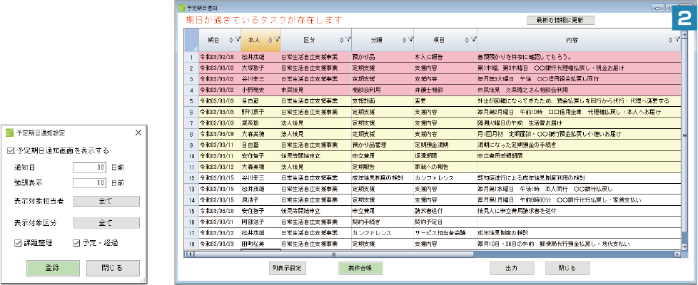 - システム起動時に、スケジュールの迫ったタスクを表示させることができます。また「予定期日通知設定」画面で、表示する期日の範囲、対象範囲を絞ることができます。期日が経過したタスクは “赤色”、強調表示に設定した期日は “黄色” に表示されます。
