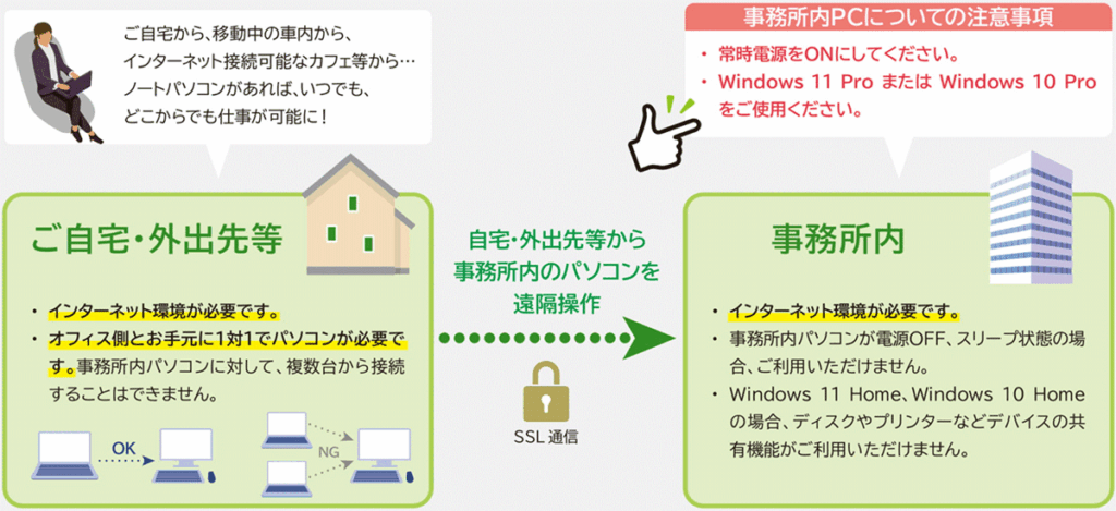 外出先やご自宅から事務所のパソコンを操作可能!テレワークの推進に貢献します!