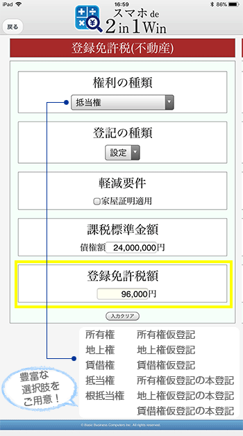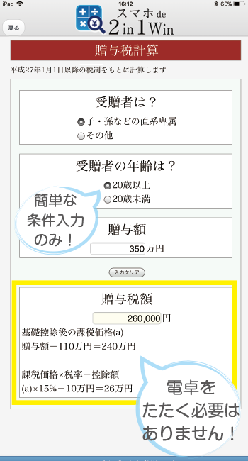 条件を入力するだけで、お打ち合せの場ですぐに各種税計算が可能!もう電卓は必要ありません!