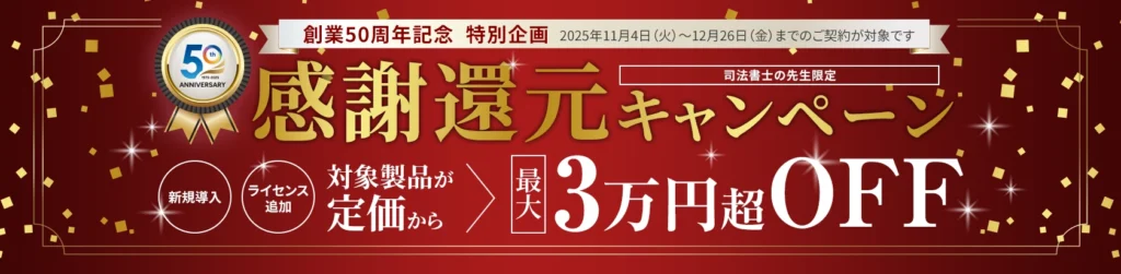 「製品単品での新規導入」、「オプション追加のみ」のご契約は対象外となります。 ※キャンペーン内容は予告なく変更となる場合がございます。