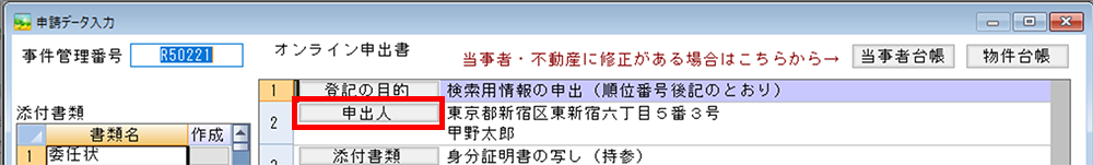 1.申請データ入力画面の申出人のボタンをクリックします。