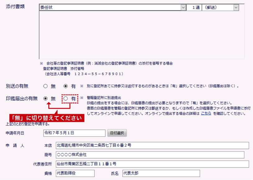 今後のバージョンにより、初期値の改修を行い、対応バージョンをリリース致します。それまでの間は、イメージ図のとおり、「印鑑届書の有無」を「有」から「無」に切り替えてから、申請書を送信ください。