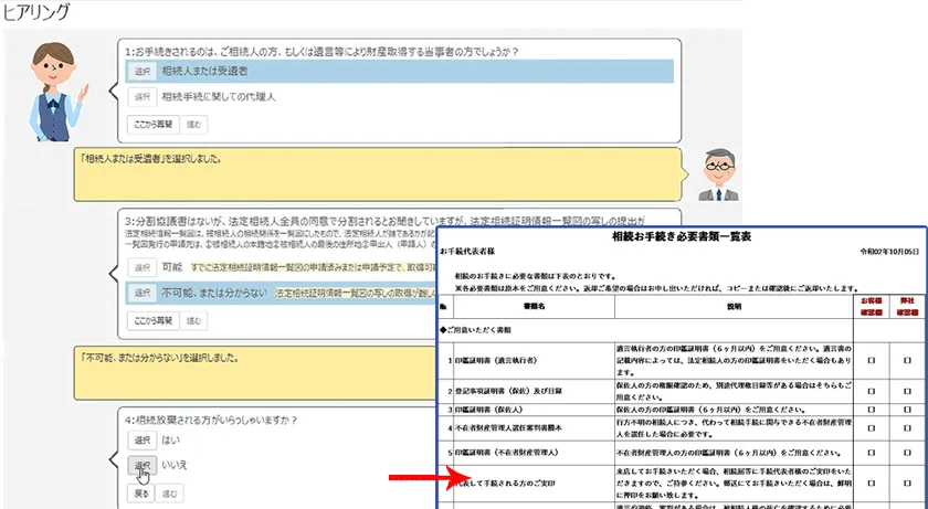 法定相続人の判定や、法定相続分の計算も自動で行います。戸籍の収集状況もリアルタイムで検証が行われ、随時不備・矛盾をお知らせします。 - 受付時ヒアリングで必要書類の判定を完全自動化