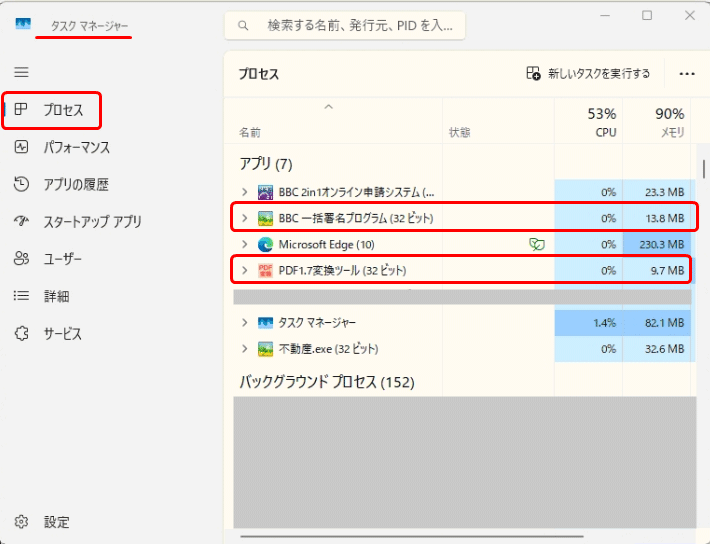 ・BBC一括署名プログラム(32ビット) - 該当するプロセスを選択し、右下「タスクの終了」を押して終了します。