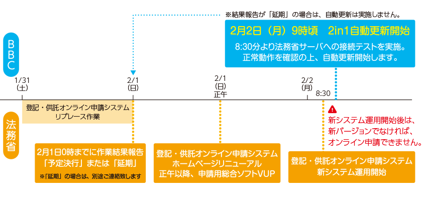 上記の予定により、令和8年2月2日(月)以降、従来のオンライン申請システムではオンライン申請等ができなくなります。この対応としてオンライン申請機能を持つ弊社の下記システムは、登記・供託オンライン申請システム リプレースに対応したバージョンアップを以下の日程で予定しております。
