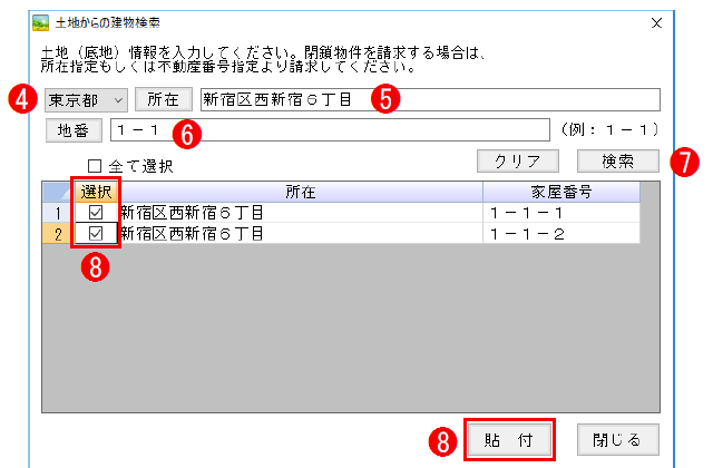 登記情報提供サービスで検索した結果が表示されます。 - [選択]をチェックして、[貼付]をクリックすると、請求物件入力タブに戻り、所在及び家屋番号が転記されています。