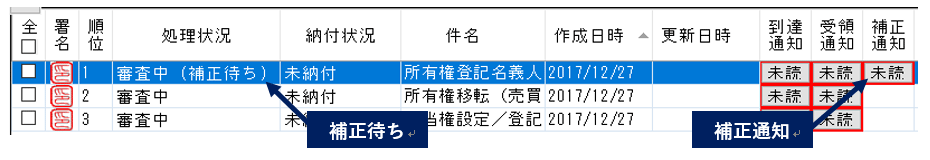 ボタンをクリックすると、登記官の補正通知を確認することができます。また、処理状況が「審査中(補正待ち)」でなければ、補正書を送信することはできません。
