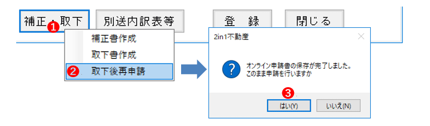 - 申請データ入力画面下にある[補正・取下]ボタンをクリック