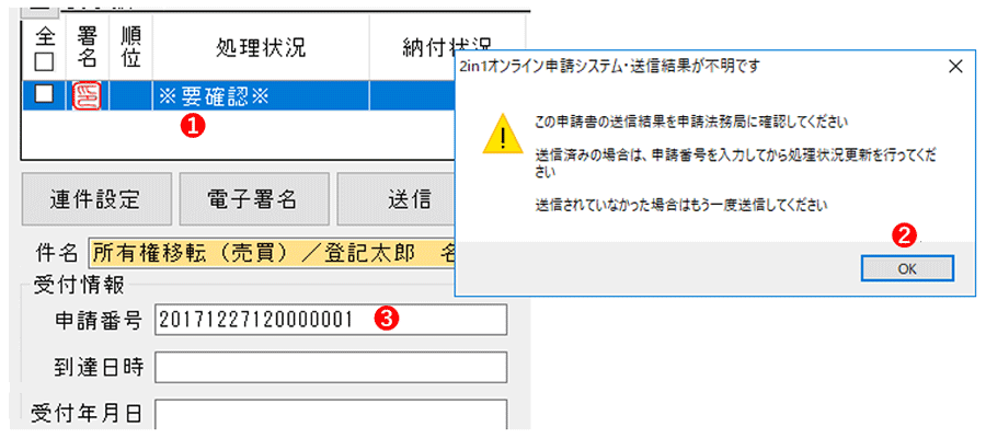 「申請番号」を本システムの画面左下にある申請番号欄に入力して「処理状況更新」ボタンをクリックすれば、正常に回復します。