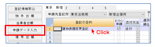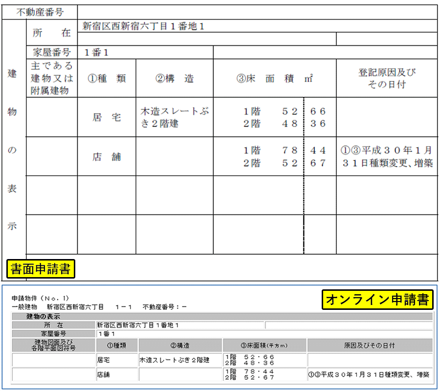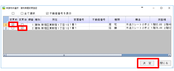 物件台帳>建物の1行目に変更前、2行目に変更後の入力を行います。建物更正登記、建物変更更正登記も同じ手順で入力することができます。