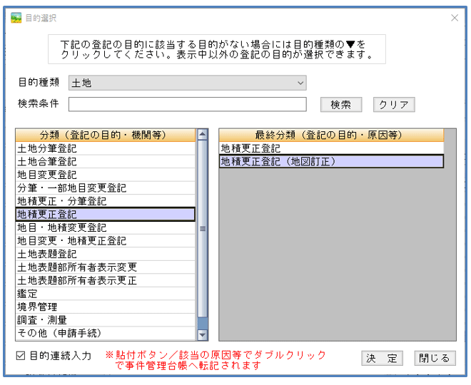 当システムでは登記の目的選択画面の土地>地積更正登記の中に「地積更正登記(地図訂正)」の目的を用意しています。通常のオンライン申請書と様式が違いますので、この目的を使用してください。