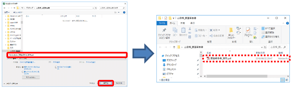 EXCEL出力後編集を行い、EXCELにてPDF変換してください。エクセルのファイル(F)>名前を付けて保存を選択します。保存したい場所を選択すると「名前を付けて保存」画面が開きます。ファイルの種類を「PDF(*.pdf)」に変更します。「保存」ボタンをクリックすると、指定した場所にPDFファイルが作られます。